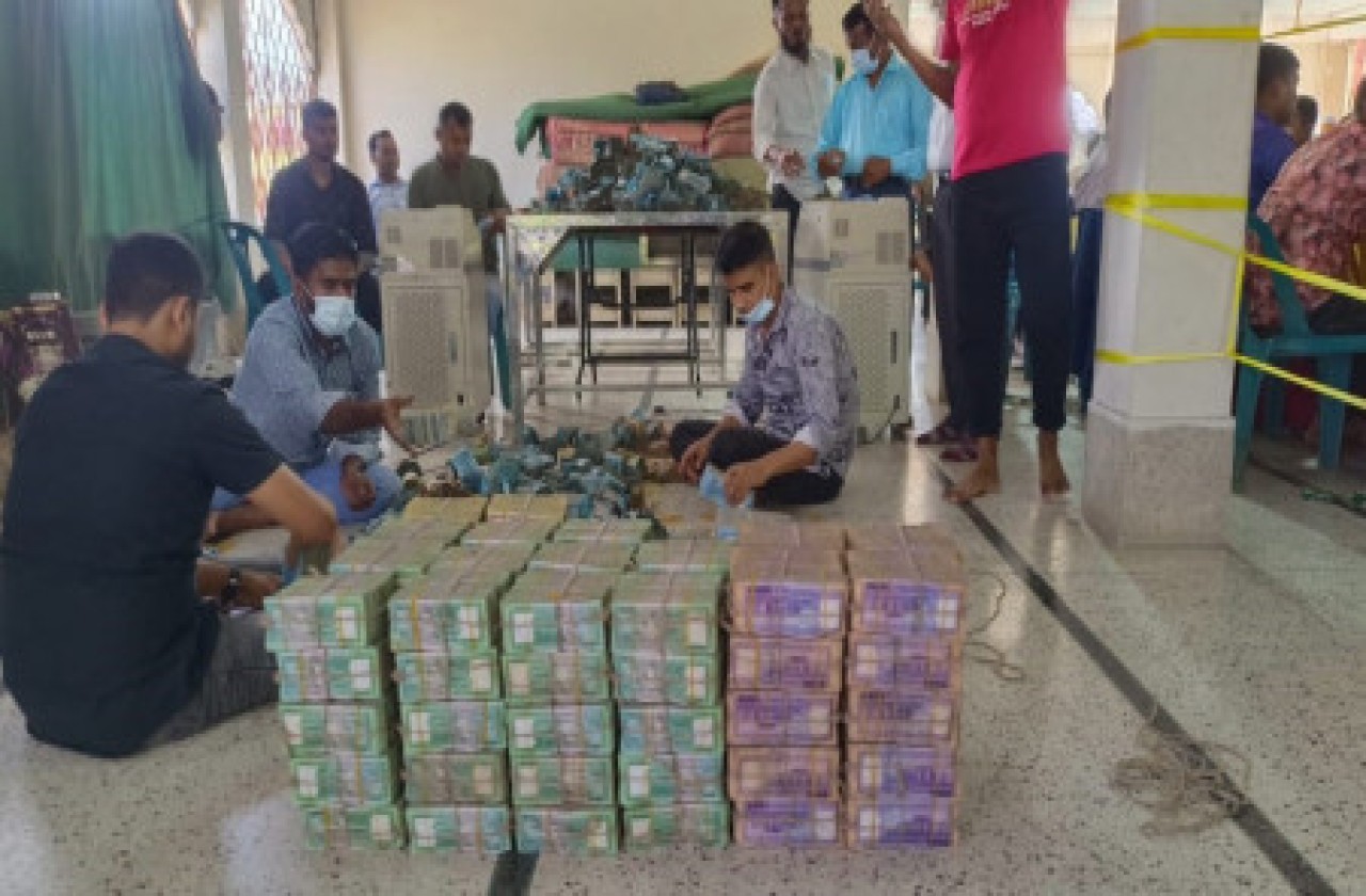 A massive heap of mixed currency notes being sorted by rows of people inside the mosque premises.